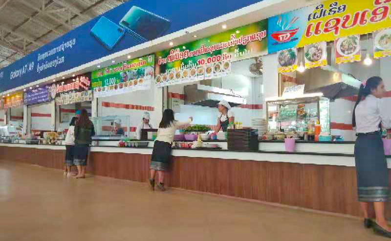 不同的食物由不同的窗口售賣,當(dāng)然打飯的窗口跟中國“玻璃窗后的阿姨似乎總有點(diǎn)手抖”不同,老撾國立大學(xué)的食堂窗口更像展會(huì)現(xiàn)場的攤位,制服統(tǒng)一的阿姨笑容滿面地等待你的到來。