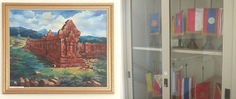 二樓樓梯拐角處掛著老撾古老寺廟油畫,旁邊的柜子里整齊擺放著幾排各國(guó)國(guó)旗;三樓樓梯拐角處掛的則是川壙省石缸平原油畫,旁邊的柜子里放置著一些老撾紀(jì)念品。