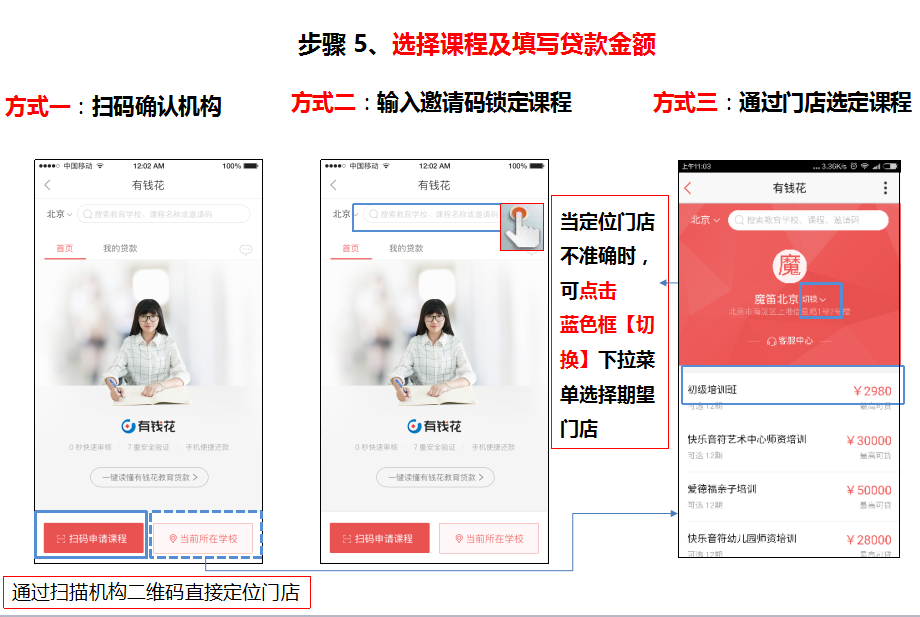 方式三:通過門店選定課程,填寫貸款金額【成交價格:與機(jī)構(gòu)確定的課程成交價格(包含首付);期望貸款金額:確定使用百度貸款的金額,成交價格-已交首付】