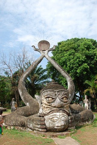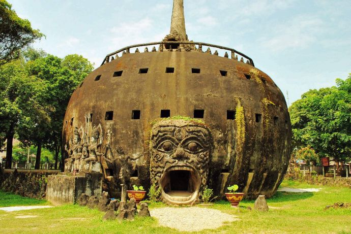 坐落在首都萬(wàn)象東南部湄公河畔上的香昆寺(又叫佛像公園),如其名,公園里到處都是千姿百態(tài)的佛像和雕塑,是一個(gè)怪人荒誕野心的紀(jì)念物。它的創(chuàng)建者創(chuàng)建者班勒威·蘇里拉是一名泰國(guó)僧侶,他將印度教和佛教的哲學(xué)思想、傳說(shuō)和肖像學(xué)融會(huì)貫通,組合成一個(gè)神秘的整體。