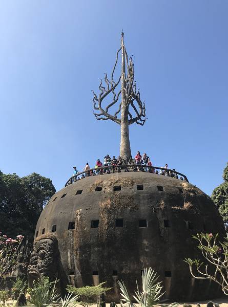 香昆寺里有一座球形的塔,與河對(duì)岸廊開(kāi)(泰國(guó))的萬(wàn)橋公園遙相呼應(yīng),這便是著名的“天堂地獄塔”。每個(gè)來(lái)這里的人都要進(jìn)去走一走,體驗(yàn)從“從地獄到天堂”的過(guò)程。