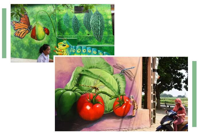 褚舍村以安全蔬菜種植業(yè)聞名,因此15幅大型壁畫(huà)重現(xiàn)了當(dāng)?shù)剞r(nóng)民的日常生活畫(huà)面,從各種農(nóng)作物、蔬菜、果園,壁畫(huà)中一個(gè)純農(nóng)業(yè)小村的畫(huà)面給參觀者帶來(lái)一種自然和美麗的視覺(jué)效果。