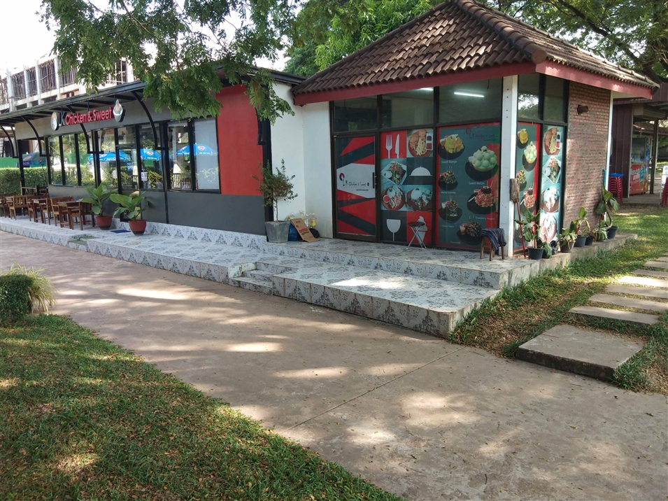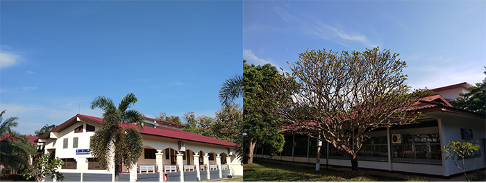 郁郁蔥蔥的東南亞特色的植被中,紅白相間的老撾語教學樓十分醒目,跳躍在金色陽光下的東南亞特色建筑教室,顯得干凈整潔。