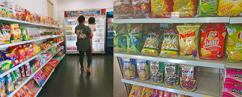 食堂區(qū)的小商店我們?cè)凇段以诶蠐雵?guó)立大學(xué)的生活—食堂篇》中介紹過(guò),其實(shí)可以猜到,既然開(kāi)在食堂,那售賣的物品當(dāng)然以食物為主,比如紅牛、牛奶、果汁、汽水之類的飲料應(yīng)有盡有,當(dāng)然,薯片、餅干也是必不可少的。