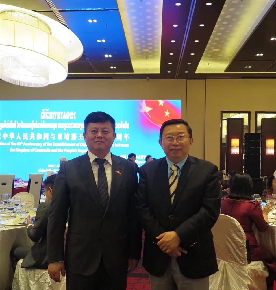 2018年北京,應柬埔寨駐華大使邀請,中國—東盟商務理事會執(zhí)行理事長許寧寧出席慶祝中柬建交60周年招待會。招待會上,與柬埔寨駐華大使館公使銜商務參贊鐵弓交談。