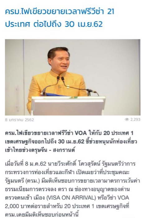 泰國落地簽免費(fèi)政策將延長至2019年4月30日